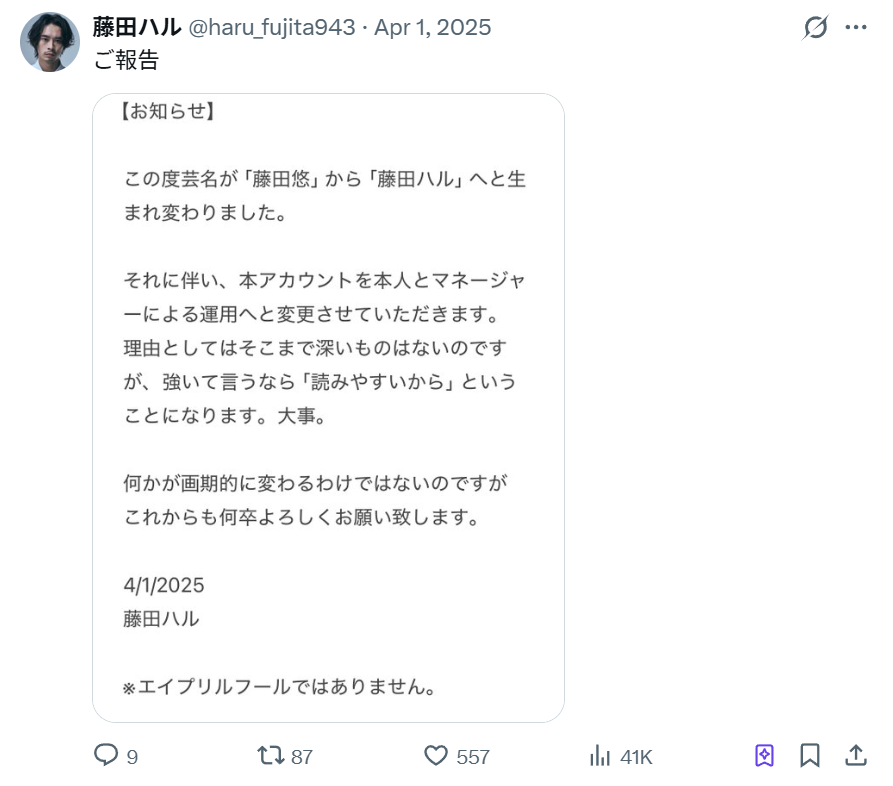 なお、2025年4月1日をもって、芸名を「藤田悠」から「藤田ハル」に改名しています。