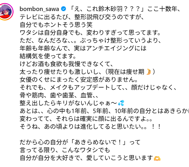 - 鈴木さん自身も美容や健康管理に力を入れている発言はあるものの、「美容整形」について言及した記録は見つかっていません。